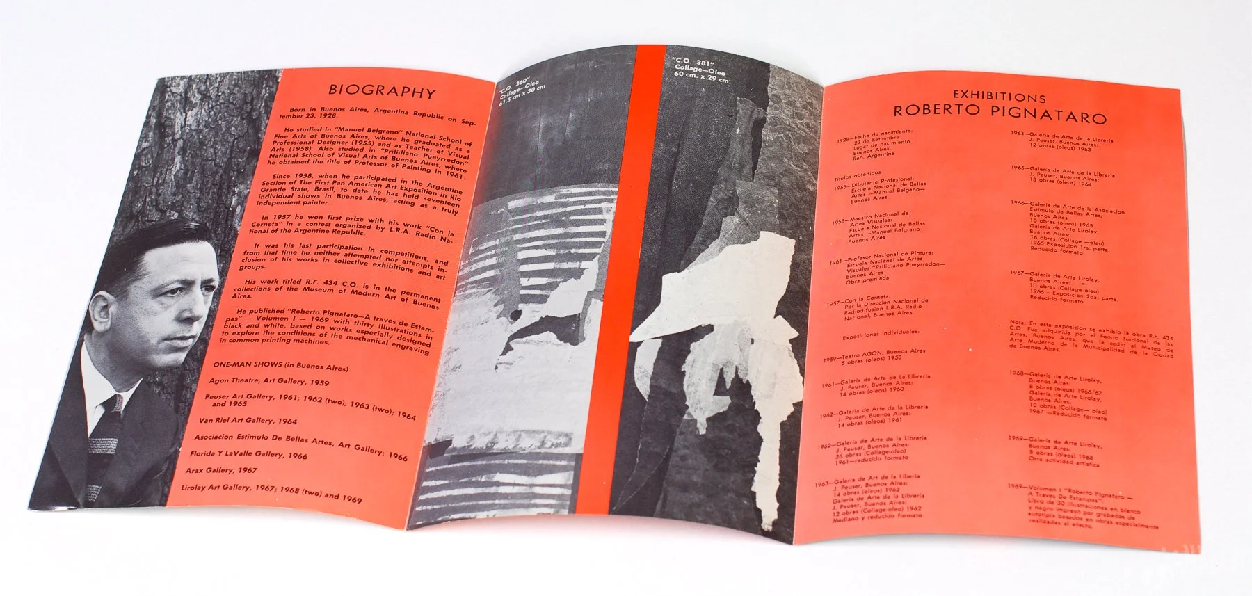 By the year 1969, Roberto Pignataro had developed a well-established presence within the Argentine art scene, with a 12-year trajectory, nineteen solo exhibitions, participation in three collective shows, and the publication of an art book.