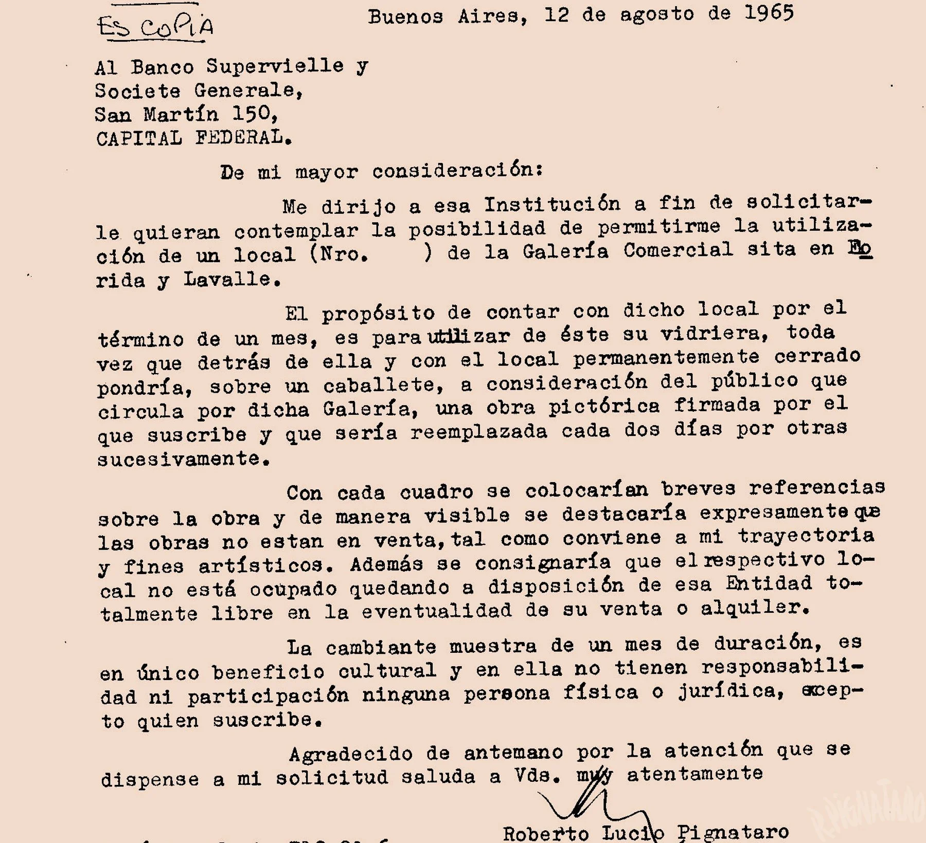 While researching this exhibition, I came across a fascinating document: a letter dated August 12, 1965, addressed to the Supervielle y Société Générale bank—the owner of the storefront at the time—in which Roberto Pignataro formally requested permission to use the space and outlined his objectives.