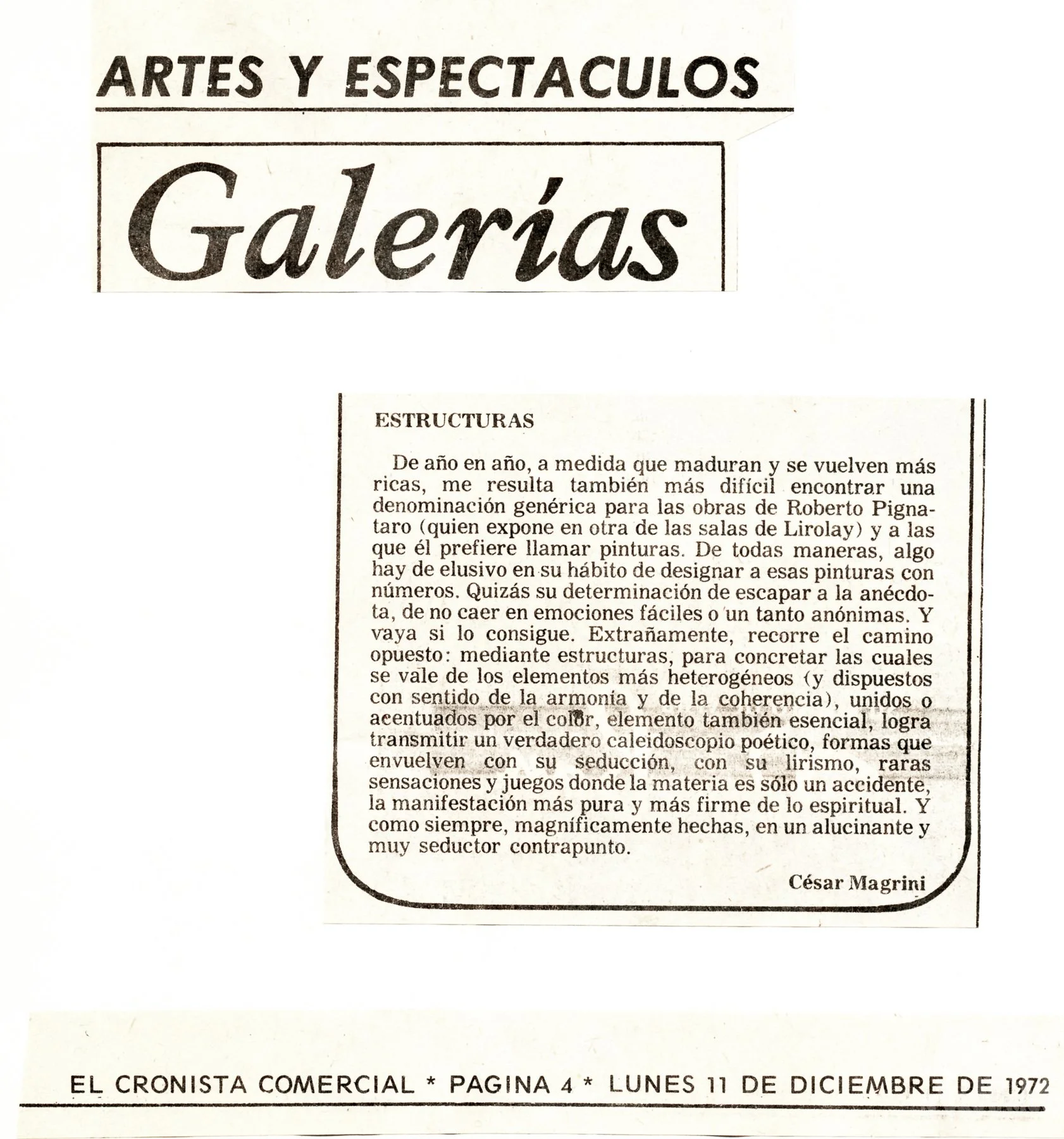 César Magrini, “Estructuras.” El Cronista Comercial (Buenos Aires), December 11, 1972, p. 4.