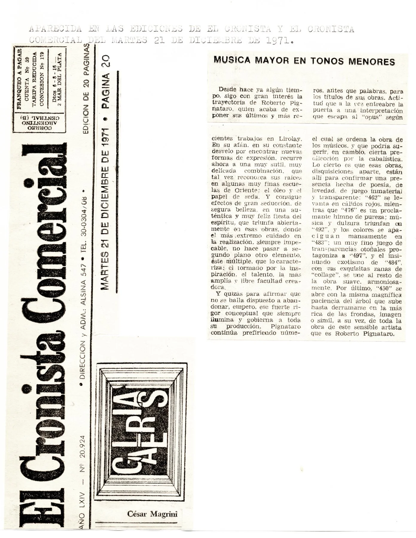 César Magrini, “Música Mayor en Tonos Menores.” El Cronista Comercial (Buenos Aires), December 21, 1971, p. 20.