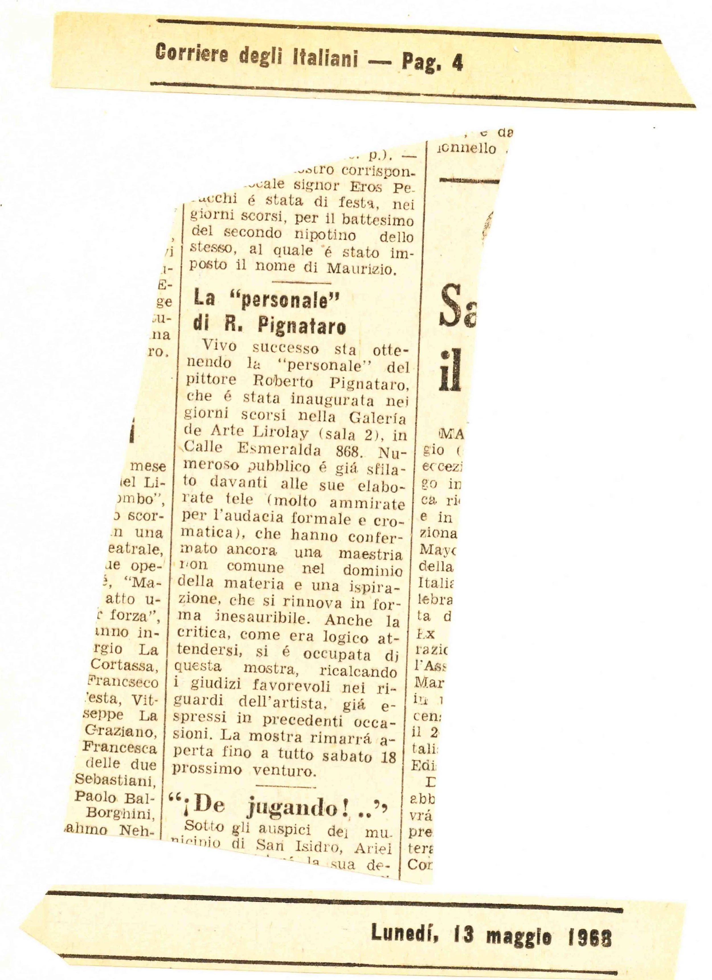 “La ‘personale’ di R. Pignataro.” Corriere degli Italiani (Buenos Aires), May 13, 1968, p. 4.