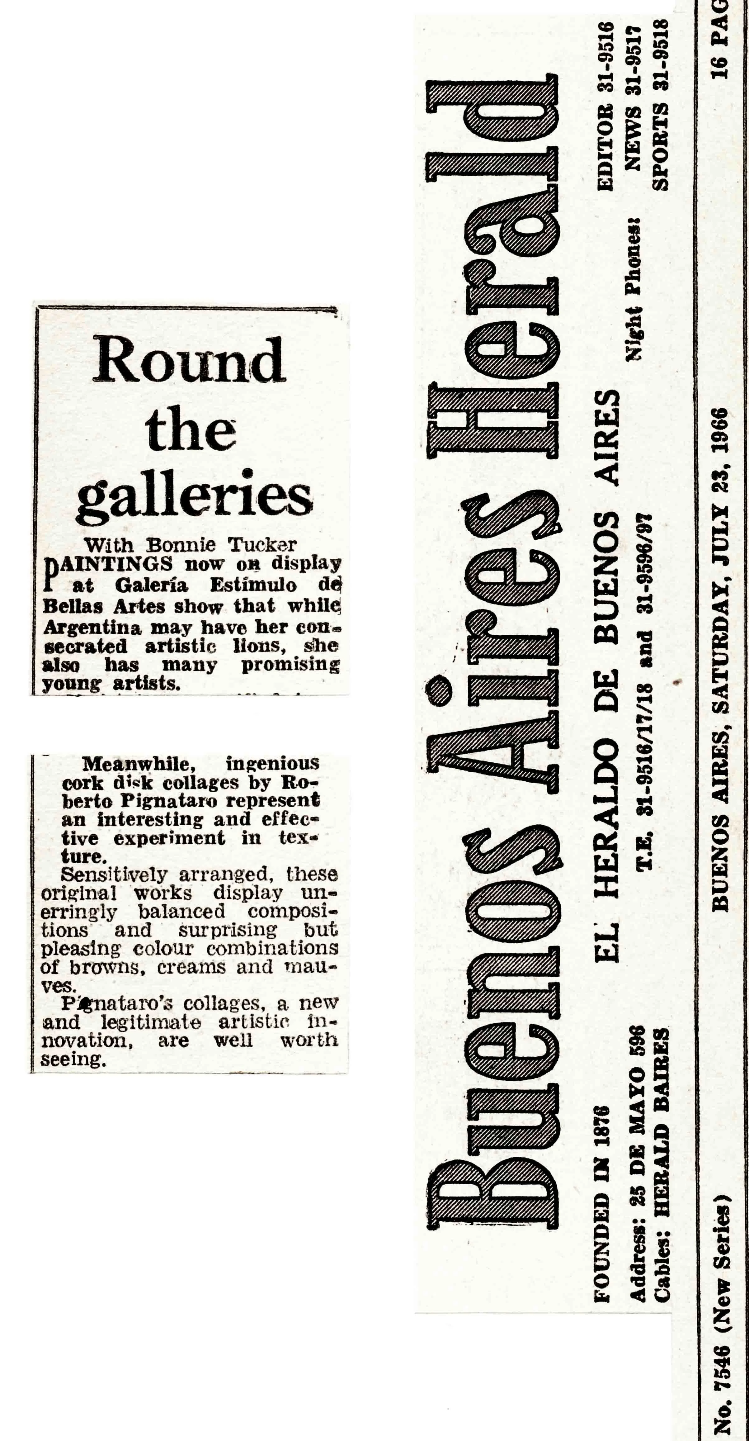 Bonnie Tucker, “Round the galleries,”Buenos Aires Herald (Buenos Aires), Saturday, July 23, 1966.